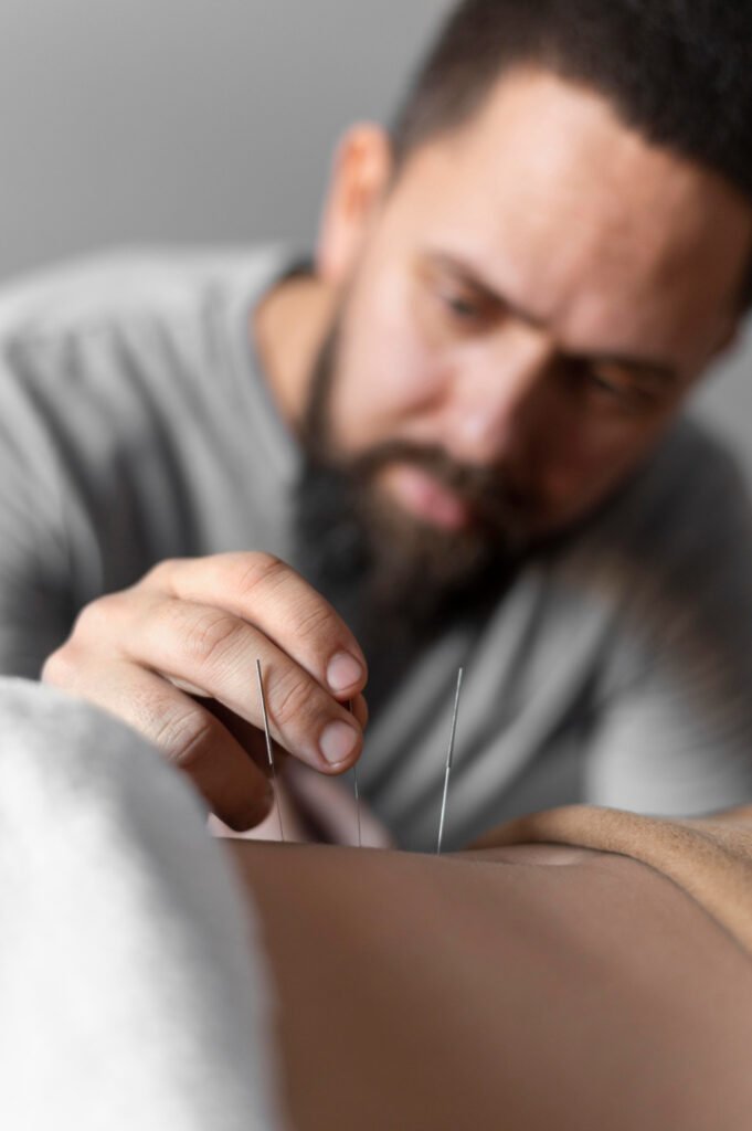 Acupuncture is the ancient Chinese system of using needles to be inserted to skin to help regulate function in the human body. The needles are inserted into the strategic body points to help with pain relief and increase movement.
